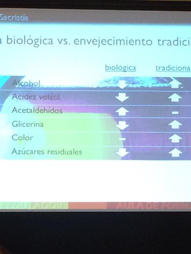 The slide below – photographed at last year’s sherryfest during a masterclass by the great Cesar Saldana – is probably the best summary I have seen of the effects of biological vs oxidative or “traditional” ageing.