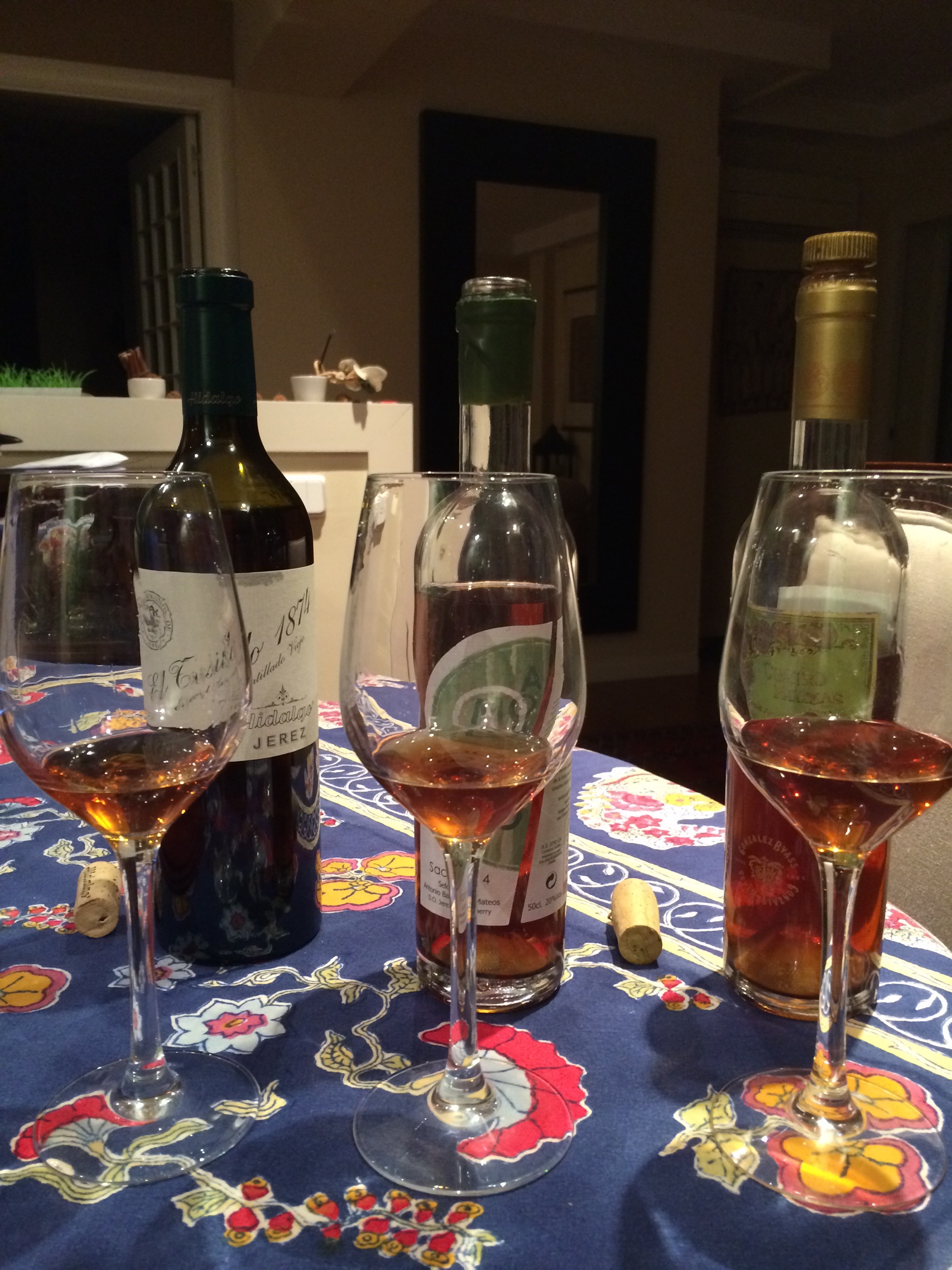 Three superb wines – the Tresillo 1874, the Amontillado Sacristia AB, and the Cuatro Palmas. Looking at this picture I am overcome with guilt at the gluttony of it all. (You may be overcome by the table cloth). Boy was this fun.