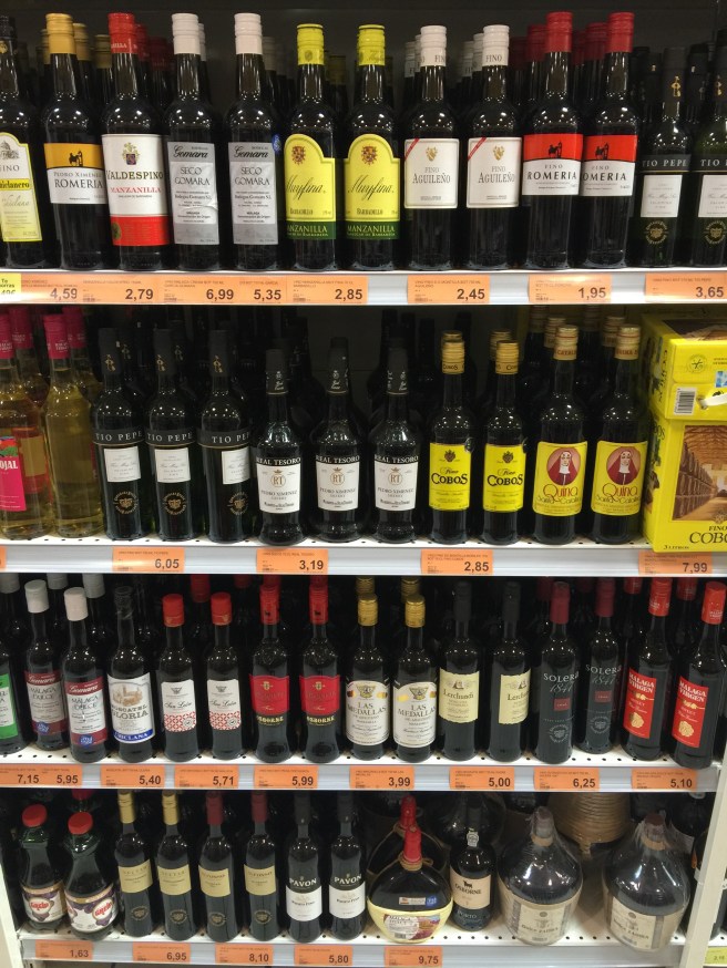 So imagine my joy at witnessing this vastly improved sherry offering at the local Supersol just now (in fact I couldn’t fit the top shelf in the shot, so it is even better than it looks). The sherries are of course sharing the shelf with the malaga wines, and ok, we are not looking at the top end of the range, but there is nonetheless a cracking choice of finos and manzanillas here. In the end I picked up a bottle of the Las Medallas that I tried recently in Taberna Palo Cortado, but I am looking forward to having a good go at these in general. In any event, it must be great news to see a bigger selection of these great wines on the shelf. And just look at the prices!