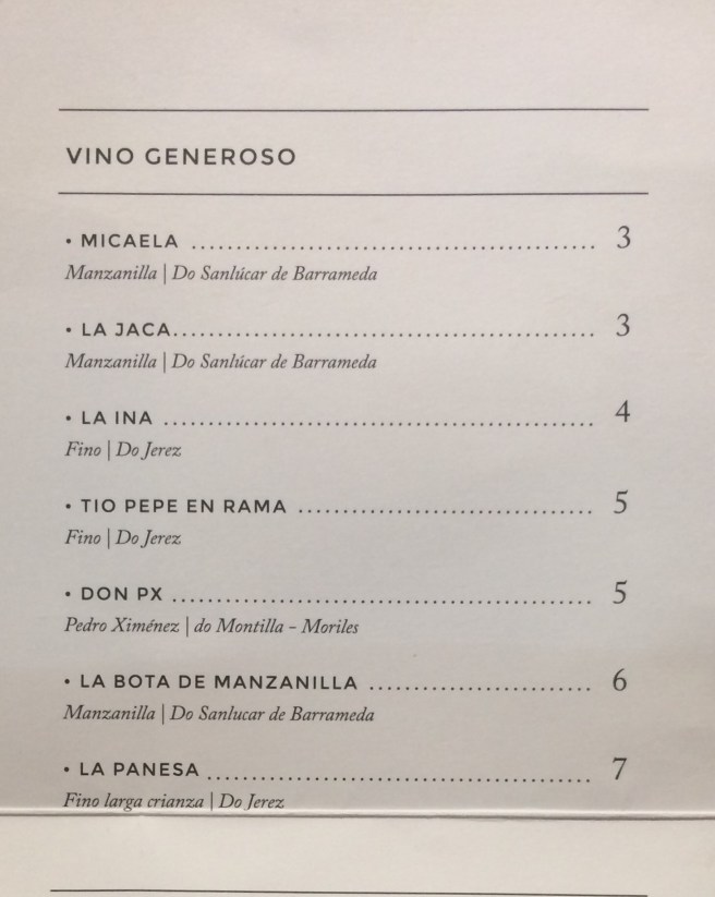 Here is that sherry list I mentioned in a post a while ago. As you will see, has a lot of bases covered at the fino/manzanilla end although would maybe be good to see some amontillado, oloroso, and palo cortado choices. Given that it is primarily a seafood establishment one can perhaps understand ….