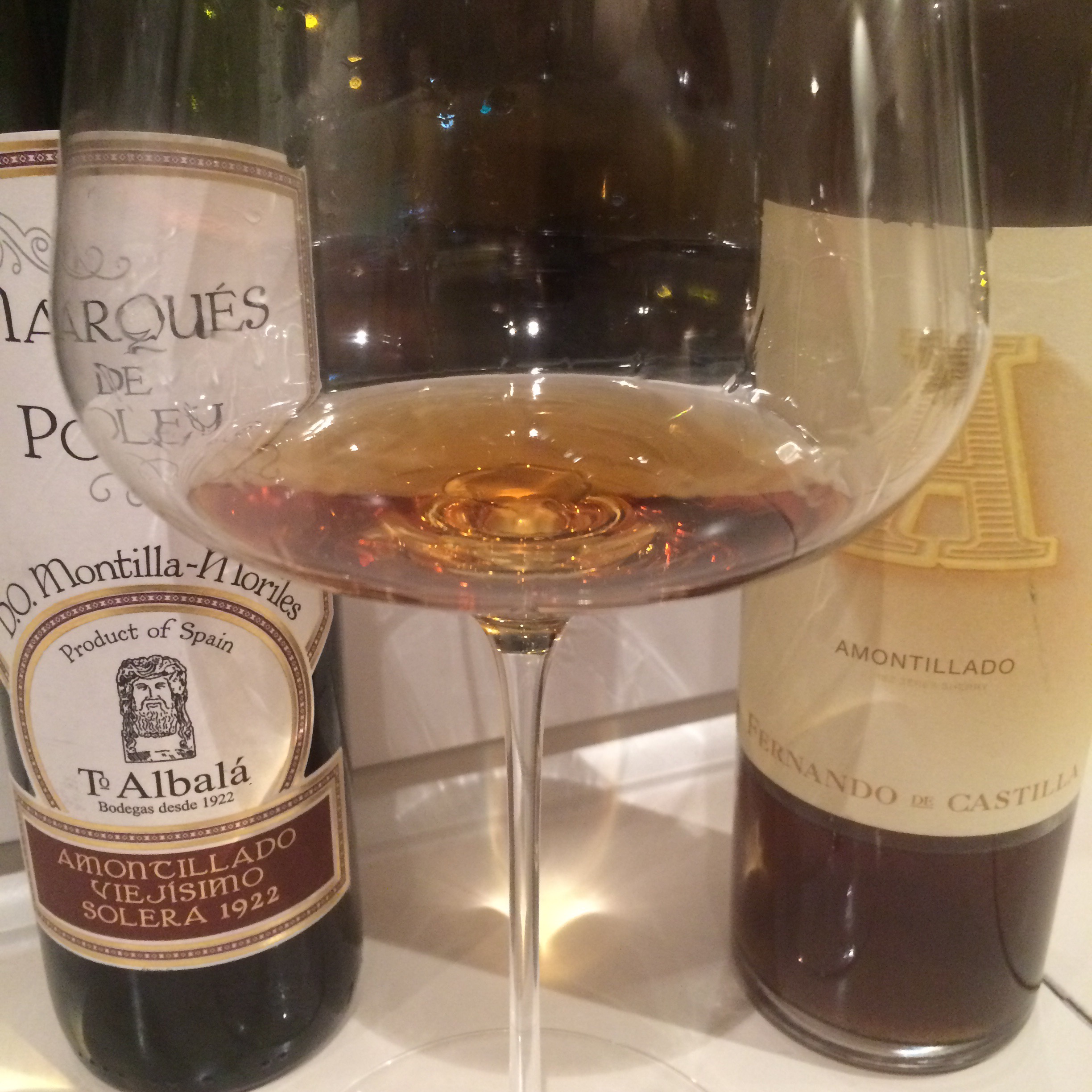 On the right, Fernando de Castilla Antique Amontillado: palomino fino, unfiltered, dusty dry and old in name, spirit and feel. On the left, the Marques de Poley amontillado viejisimo: pedro ximenez, nearly sweet, rich and juicy. Two totally distinct examples of what an amontillado can be.