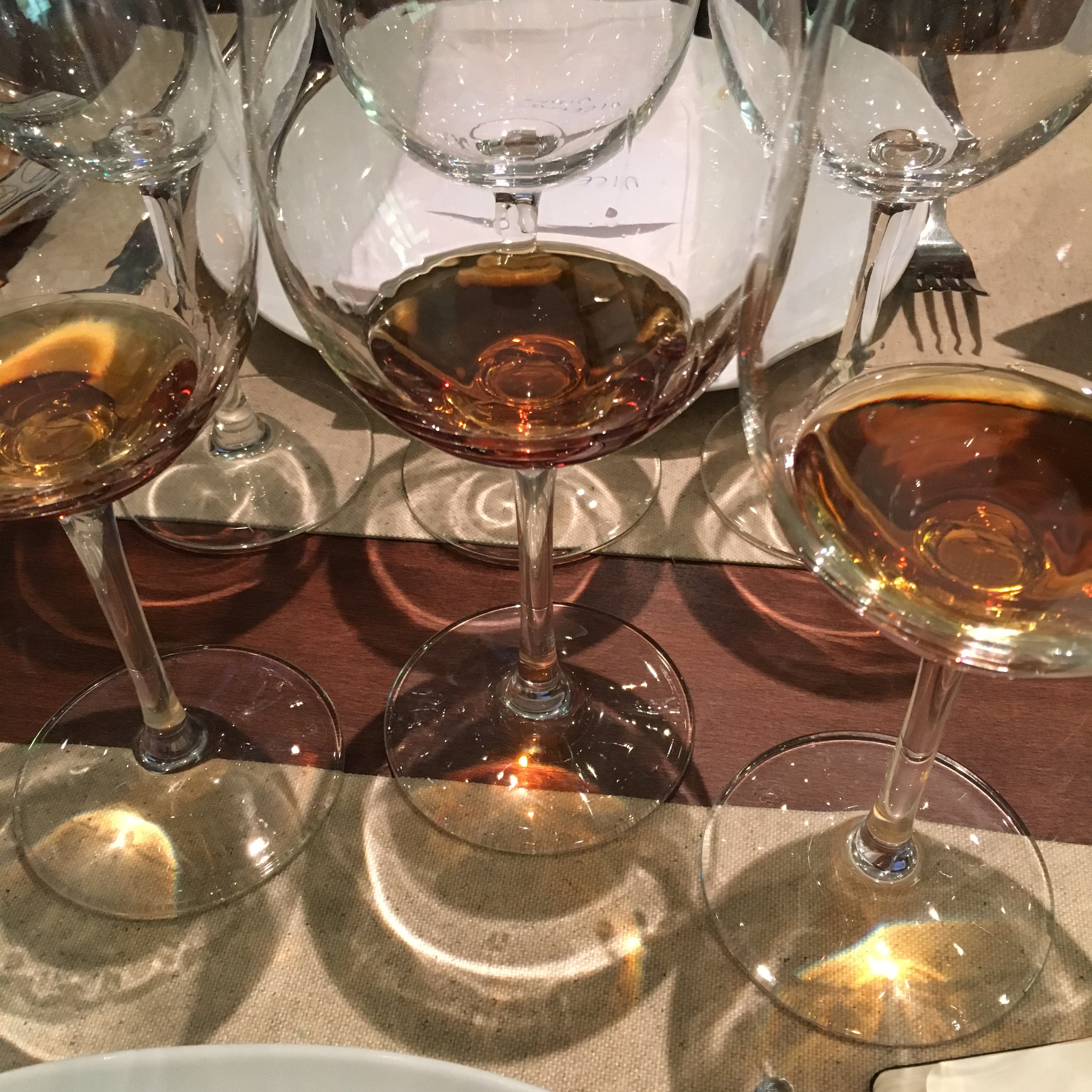 Last night we had five wines: a very nice fino en rama – fruitful, yeasty and juicy – with around eight years under flor, and four VORS wines with an average age of 45 years – the amontillado, oloroso and palo cortado, pictured above, and a very youthful tasting 45 year old Pedro Ximenez. Five excellent wines – I particularly liked the fino and the punchy, saline oloroso, but the amontillado was elegant and smokey and the palo cortado had a bit of spirit to it.