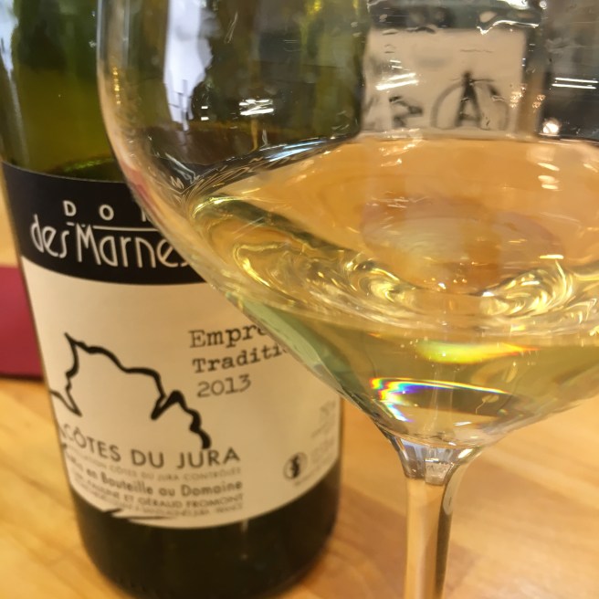 One of the interesting wines on offer at Territorio Era and one I have been back to a couple of times, this is a 2013 “Tradition” Cotes du Jura – 60% savagnin (minerals and acidity) and 40% chardonnay (body) with three years under flor.
