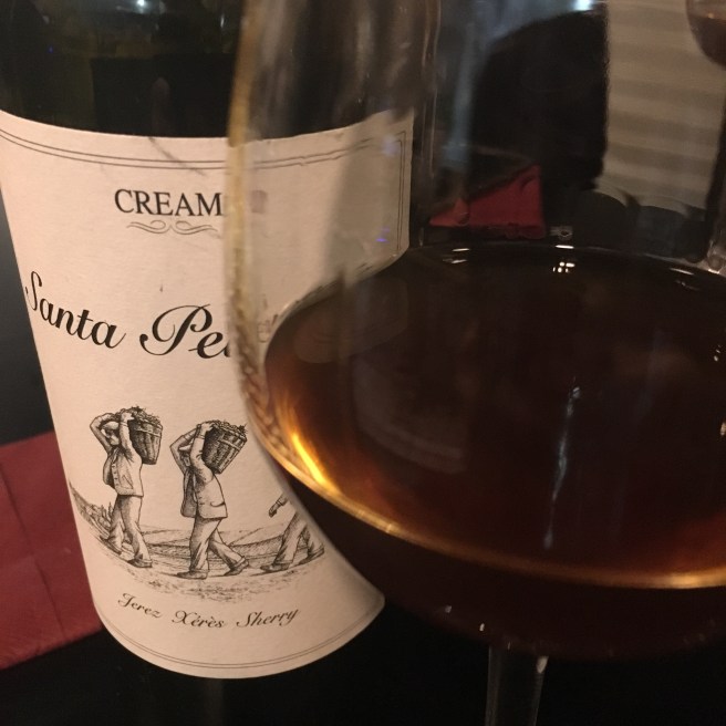 The photo isn’t great but it is a dark and appetising brown colour – dark raisins with a gold lining – and for a cream it has a striking nose with a lot of volatile acidity (something I also noticed in the oloroso). Not overlong or structured but it has an elegant feel to it – not at all heavy or sticky – and a very nice flavour profile of nuts and raisins, with just a little bit of edge from that acidity.