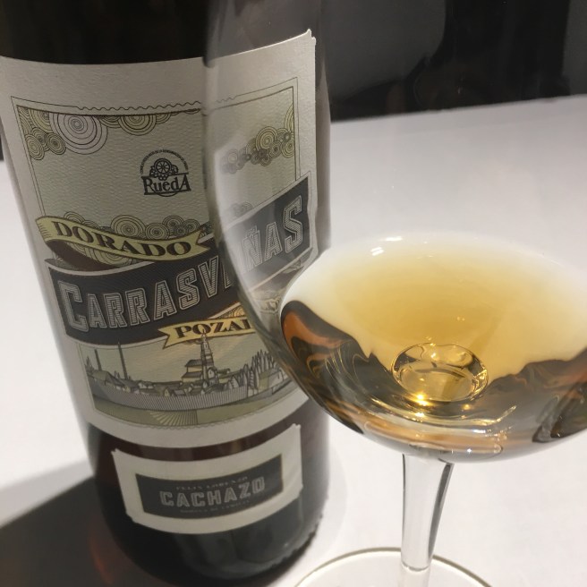 You can find a ficha here in Spanish and as you will see that it is an unfortified blend of palomino and verdejo (proportion not revealed but order of varietals suggests more verdejo) that have been separately fermented in inox before coupage. Then it is stored in 16L glass demijuanas for 18 months and subjected to the extremes of the Castilian summer – which leads to the oxidation – before being finished in oak barrels. (Although it all sounds like a single vintage process I couldn’t find a date on the label or bottle.)