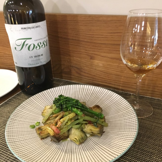 Not just any veggies – the superb “Verde que te quiero verde” in Taberna Verdejo: horseradish, artichokes, borage, chard, asparagus and whatsit broccoli. Pairs with this gem of an amontillado – sharp, smooth and savoury rich – like a metaphorical glove.