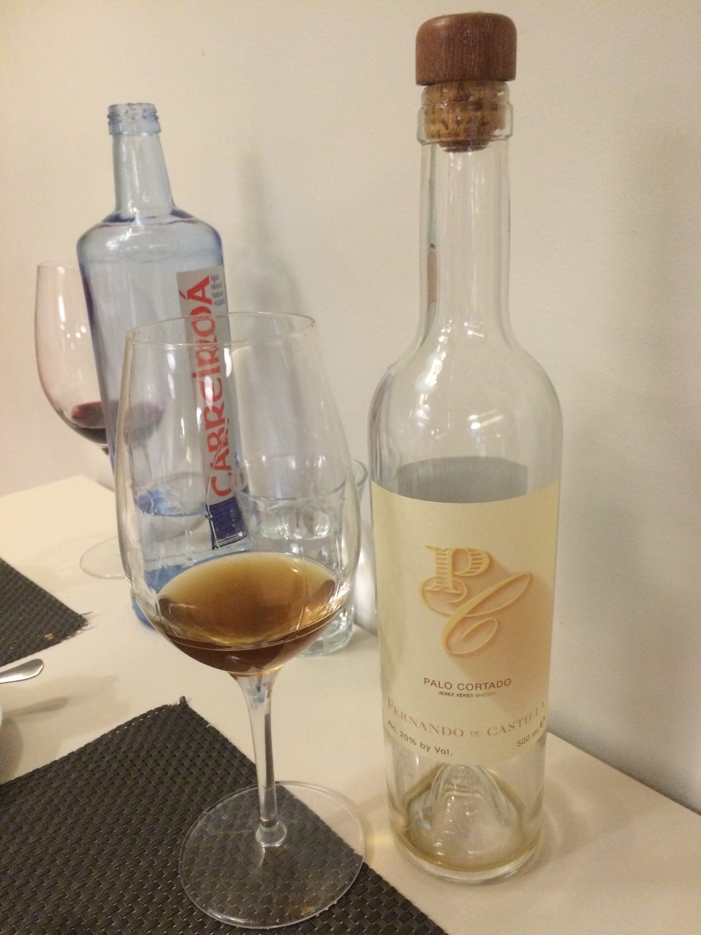 And on we go, to the mackerel escabeche, with the Monteagudo Amontillado – also from Delgado Zuleta. To be honest, I have messed up this pairing – the mackerel is delicious, the monty too, but they are at odds. One (zee fishh) is vinegary and sweet, the other mellow and dry. My bad.